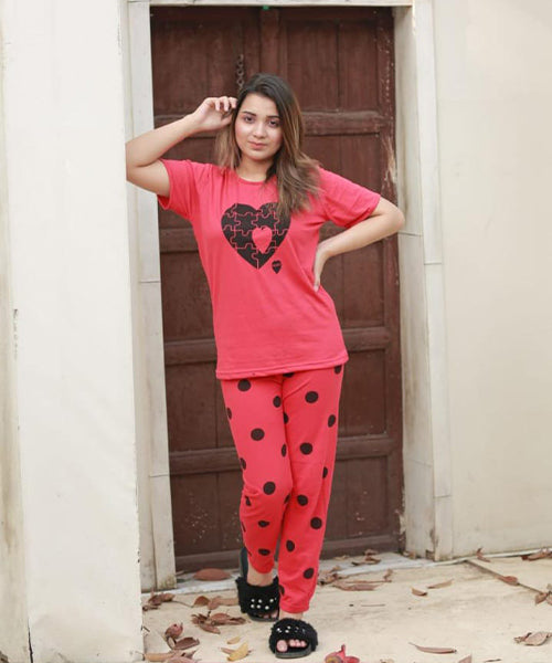 Stay effortlessly stylish and comfy with our Red Polka Dot Nightwear Set featuring a cute heart puzzle print top. Crafted from soft, breathable cotton fabric, this set ensures ultimate comfort for both lounging and sleeping....